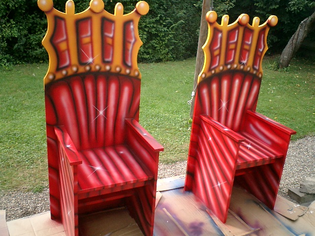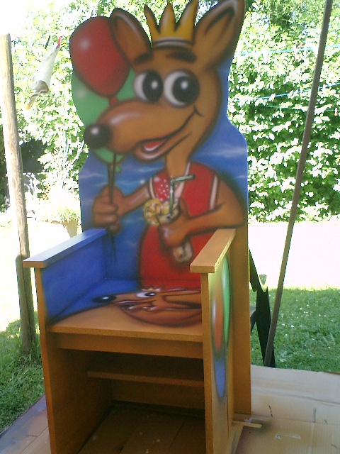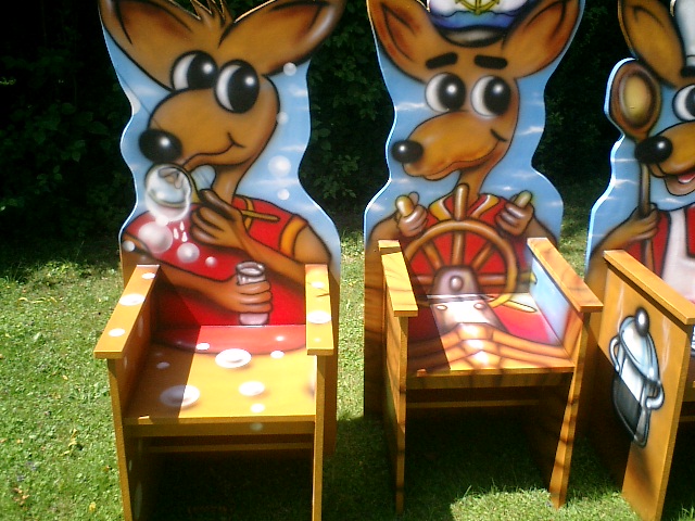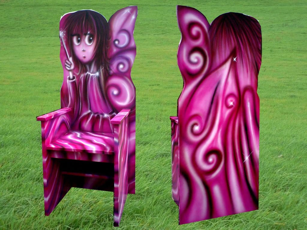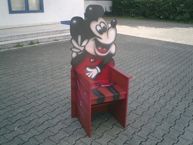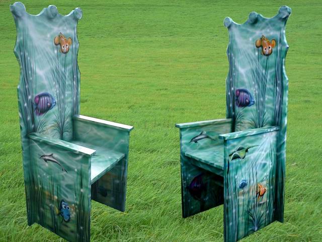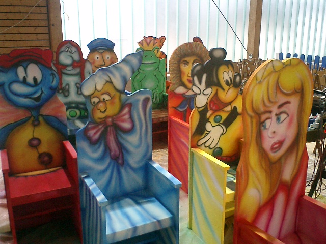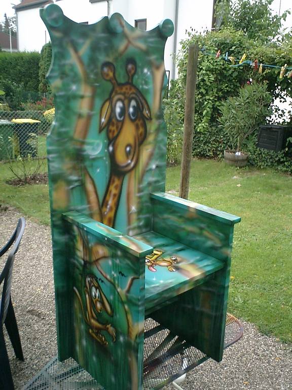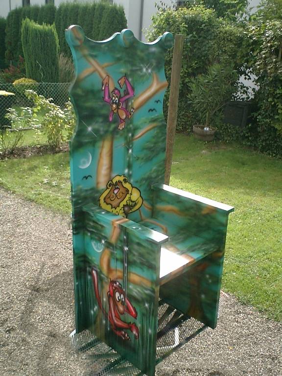 Individuell in Form gesägter Thron für Kinder in Airbrushtechnik bemalt mit Comics, Märchenfiguren und Themenbereichen