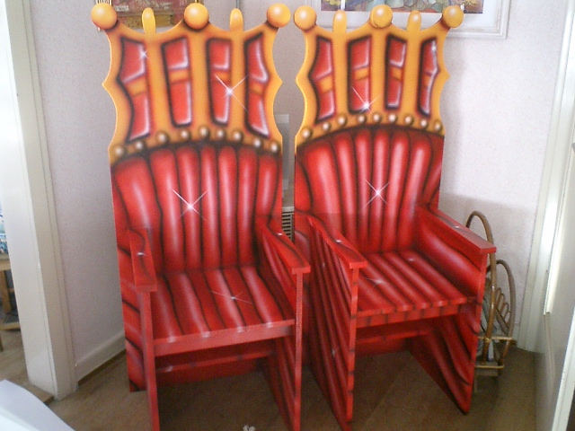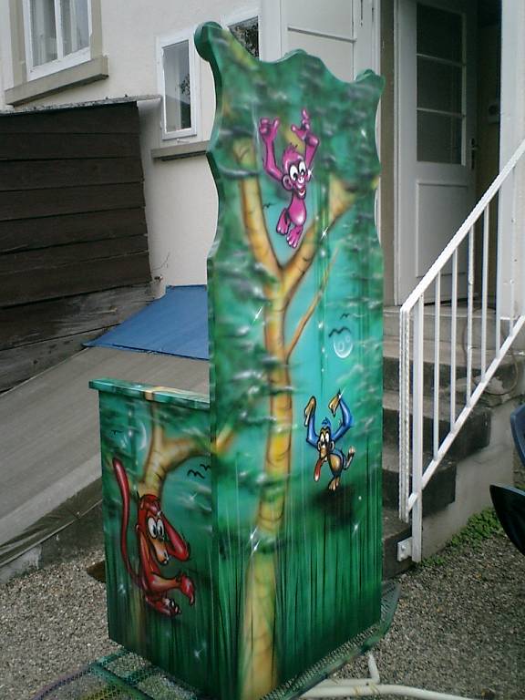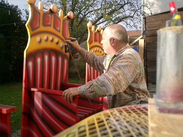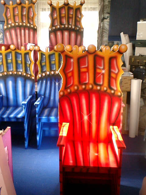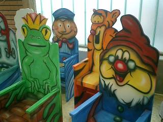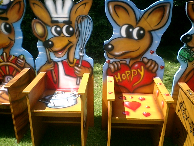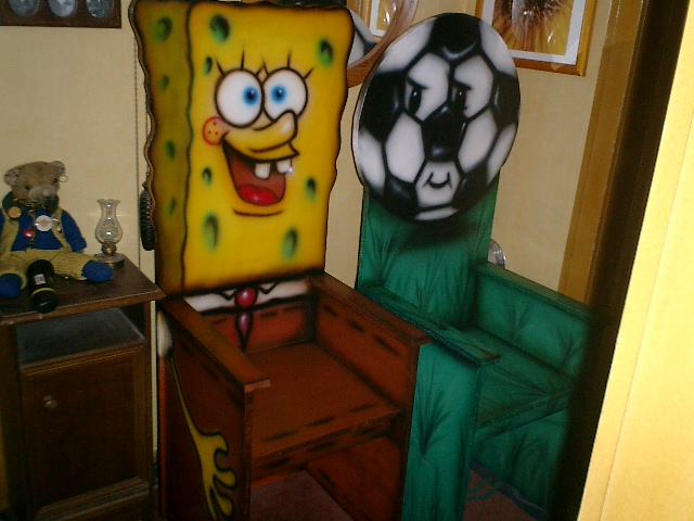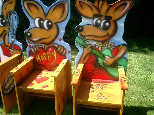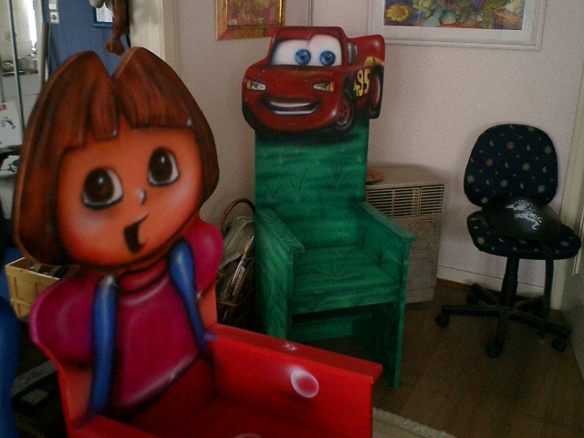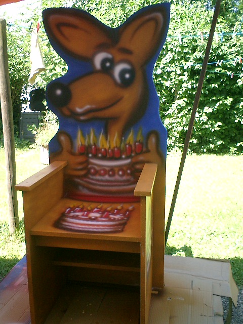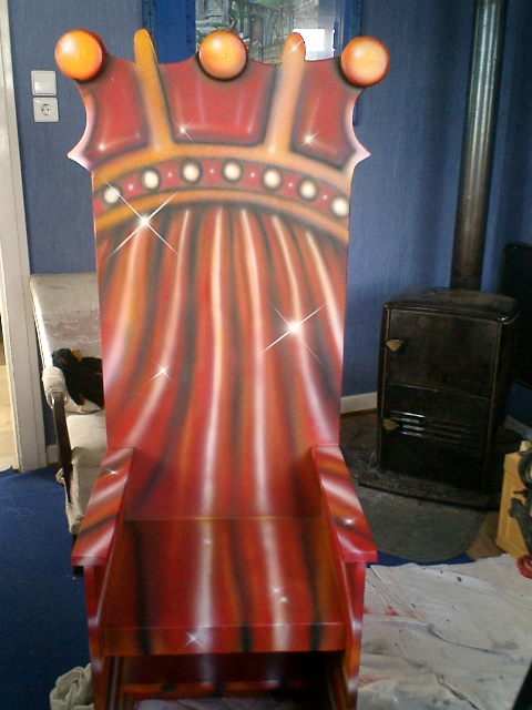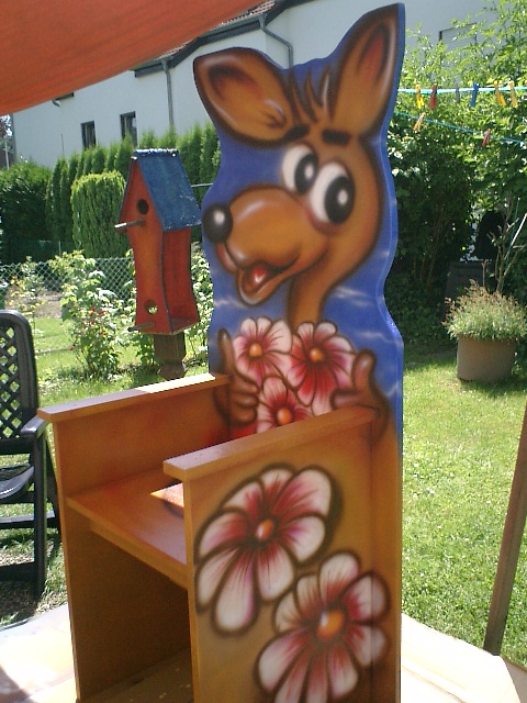 Individuell in Form gesägter Thron für Kinder in Airbrushtechnik bemalt mit Comics, Märchenfiguren und Themenbereichen